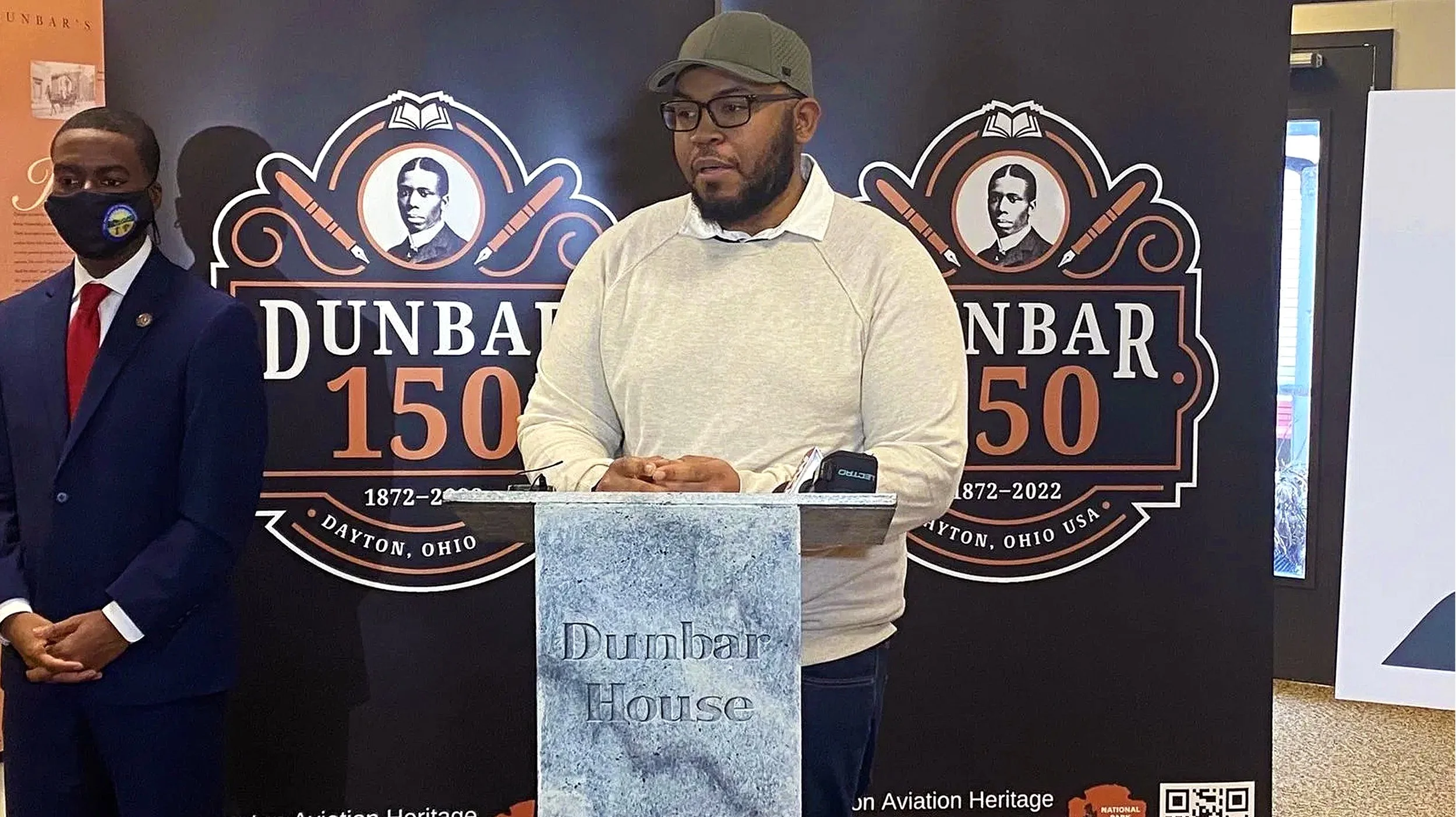 State Rep. Willis Blackshear Jr. joined others Friday to unveil the artwork for the proposed Paul Laurence Dunbar commemorative license plate at the historic site of the poet's house in Dayton. (Dayton 24/7 Now photo)